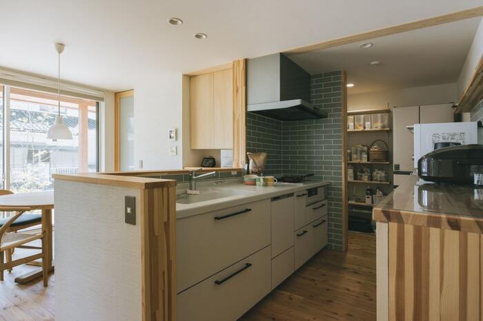 家事に子育てにと忙しい日々の負担を軽減する、玄関からキッチン横のパントリーにつながる動線もしっかり確保しています。